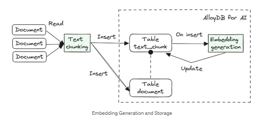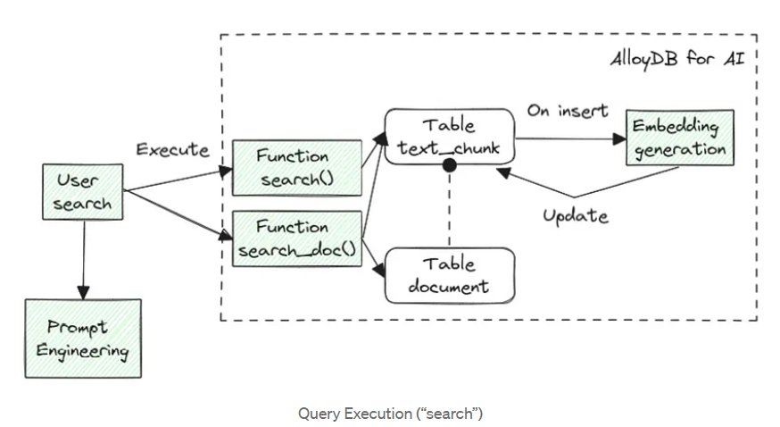 The RAG (Retrieval-Augmented Generation) architecture enhances natural language processing by integrating retrieval and generation mechanisms. The process begins with user queries that undergo prompt engineering to be formatted for processing. The search() function accesses the AlloyDB for AI database to fetch relevant information, while search_doc() interacts with a document table to update and retrieve text data. Text chunks stored in the “text_chunk” table are processed to generate embeddings, which represent the data for analysis. When new data is inserted into this table, an execution trigger runs the necessary functions. The system ultimately retrieves relevant information and generates responses, effectively combining data management and response generation to improve AI-driven natural language understanding and generation.