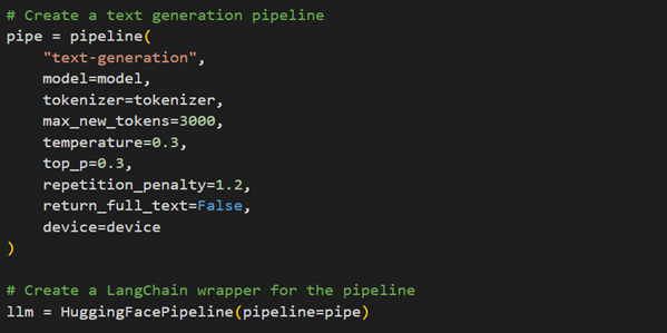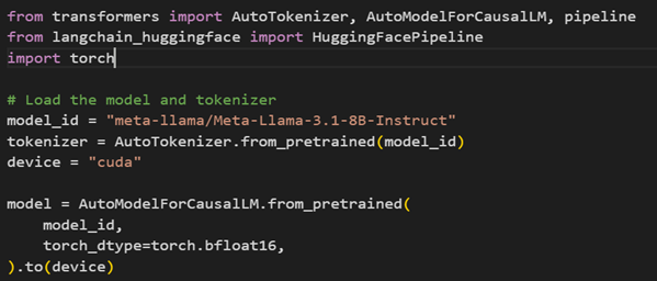 Here are the code snippets to load Llama 3.1 8B-Instruct model using Hugging Face and create a LLM pipeline.