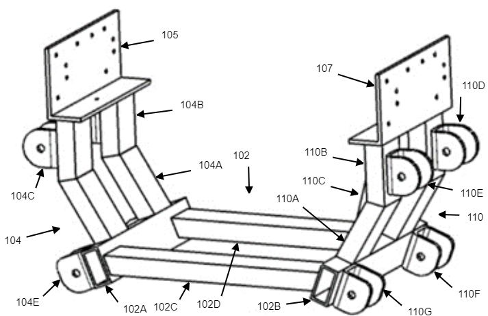 - At least two longitudinal members (120A, 120B) extending between the left and right ends (102A, 102B) of the base (102);